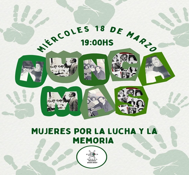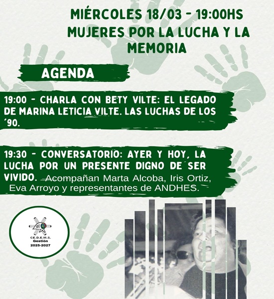 Este miércoles 18 de marzo a las 19 horas, en la sede central del CEDEMS y con transmisión en las redes sociales, se realizará la charla “Mujeres por la lucha y la memoria”.
