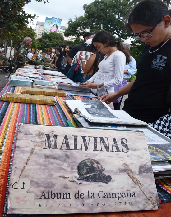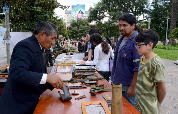 La muestra estuvo desde la mañana contando con testimonio de los mismos veteranos de Jujuy los cuales mostraban y explicaban a quienes se acercaban como fue la experiencia y el día a día en el campo de guerra, mostrando algunos artefactos tanto de uso cotidiano como también de combate.