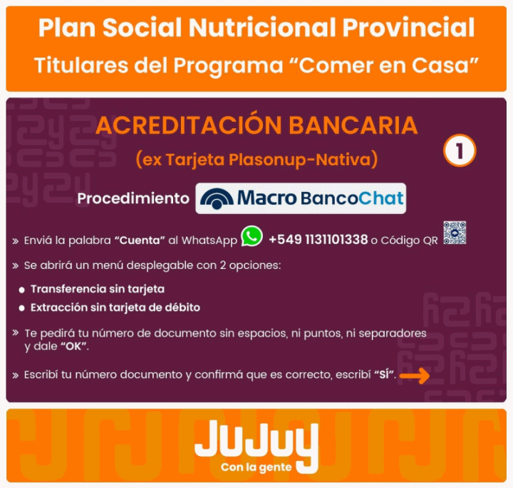 El Ministerio de Desarrollo Humano, por medio de la Secretaría de Asistencia Directa, comunica que a partir de hoy, sábado 23 de noviembre, se realizó la acreditación bancaria de la (ex Tarjeta PLASONUP-Nativa), correspondiente a septiembre y octubre, para los titulares de las localidades de San Salvador de Jujuy, Palpalá y Perico.