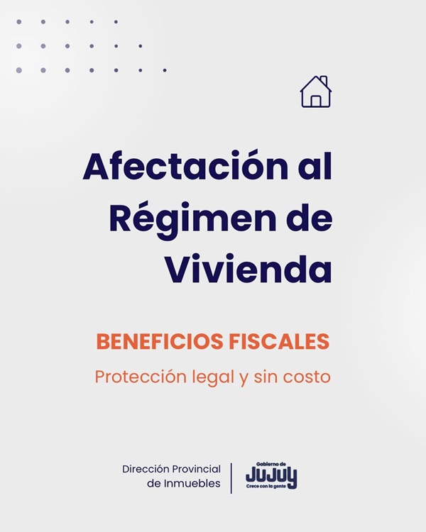 Desde la Dirección Provincial de Inmuebles de Jujuy informaron a la comunidad que la Afectación al Régimen de Vivienda (anteriormente denominado Bien de Familia) es un trámite gratuito que permite proteger legalmente el inmueble destinado a vivienda, impidiendo su ejecución por deudas contraídas con posterioridad a la afectación.