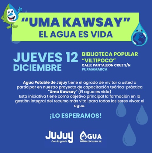 Fortalecer el conocimiento y promover la conciencia sobre la gestión integral del recurso más vital para la vida son los objetivos primordiales que abarca el proyecto “UmaKawsay” de Agua Potable de Jujuy, cuya nueva jornada de la capacitación teórico-práctica se realizará el próximo 12 de diciembre en la Biblioteca Popular «Viltipoco» de Purmamarca a partir de las 8:30 horas.