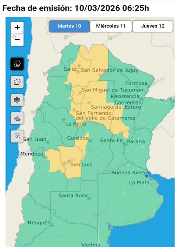 El aviso es para regiones de las provincias de Jujuy, Catamarca, Chaco, Córdoba, Formosa, Mendoza, Salta, San Luis, Santa Fe, Santiago del Estero y Tucumán.