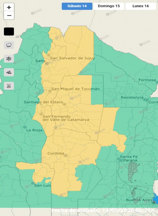 El Servicio Meteorológico Nacional (SMN) emitió una alerta amarilla por tormentas para la mayor parte de la provincia de Córdoba este sábado 14 de marzo. La misma advertencia rige para sectores de las provincias de Jujuy, San Luis, Santa Fe, Catamarca, Salta, Santiago del Estero y casi la totalidad de la provincia de Tucumán.