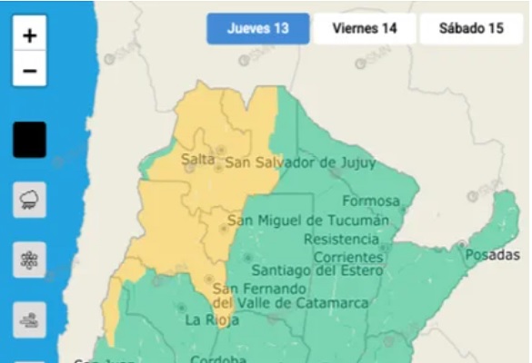 Según el SMN, en zonas con alerta amarilla, “el área será afectada por lluvias y tormentas de variada intensidad, algunas localmente fuertes. Las mismas estarán acompañadas por abundante caída de agua en cortos períodos, ocasional granizo, y ráfagas que pueden superar los 60 km/h”.