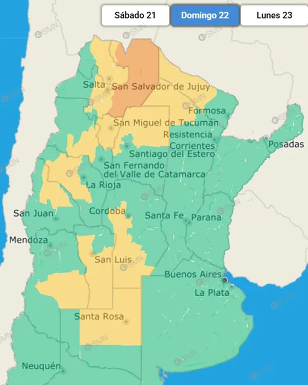 Las provincias del país que estarán afectados por la alerta amarilla de este viernes son Jujuy, Salta, Tucumán, Formosa, Chaco, Santiago del Estero, Catamarca, La Rioja, San Juan, Córdoba, San Luis, Mendoza y La Pampa.