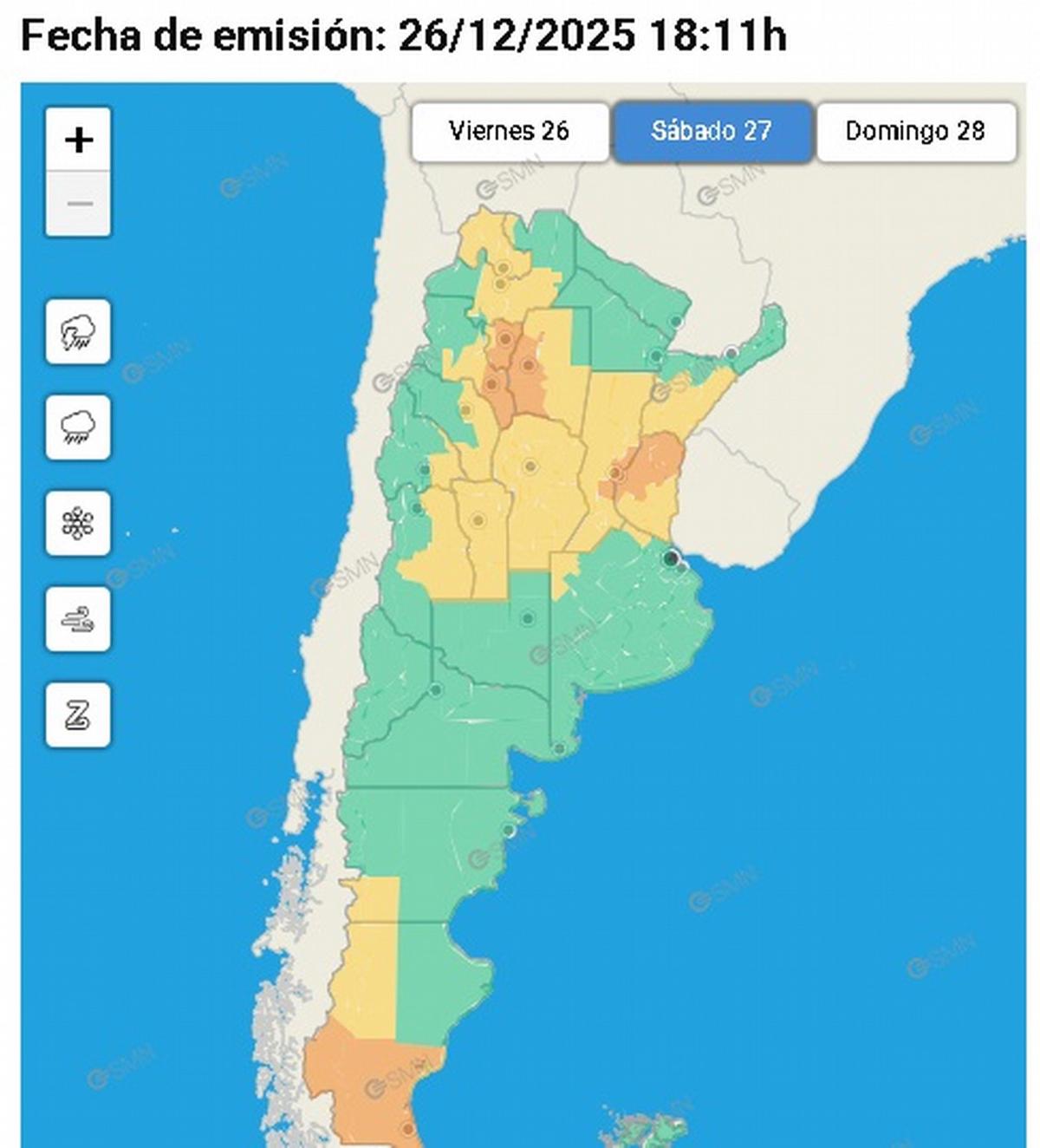El aviso abarca a distintas zonas de la provincia de Buenos Aires, Jujuy, Córdoba, Santa Fe, Entre Ríos, Corrientes, Salta, Tucumán, Santiago del Estero, La Rioja, Mendoza, San Juan, Catamarca y San Luis.