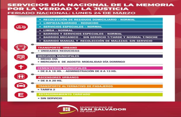 La Municipalidad de San Salvador de Jujuy comunicó las modificaciones en la prestación de algunos servicios con motivo de conmemorarse el próximo lunes 24 de marzo el Día Nacional de la Memoria por la Verdad y la Justicia.