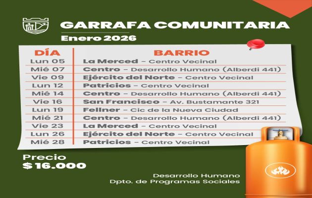 La Municipalidad de San Pedro de Jujuy, informa a la comunidad que durante el mes de enero se llevará adelante la Venta de la Garrafa Comunitaria en los diferentes sectores barriales de la ciudad en el horario de 09:00 a 12:00, con un valor de $16.000 por familia.