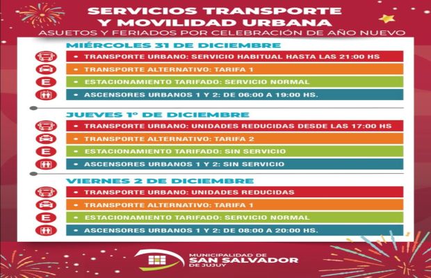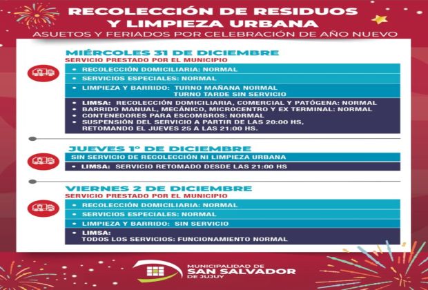Con motivo del asueto administrativo y el feriado por Año Nuevo, se informa a la comunidad cómo será el funcionamiento de los distintos servicios municipales durante los días miércoles 31 de diciembre y jueves 1 y viernes 2 de enero.