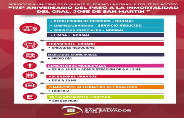De cara al día no laborable del próximo 15 de agosto por la proximidad del 175° Aniversario del paso a la inmortalidad del Gral. José de San Martí por la Municipalidad de San Salvador de Jujuy, a través de las distintas Secretarías, comunicó funcionarán los servicios durante esa jornada.