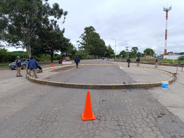 El personal de Obras Públicas trabaja con hormigón elaborado en el llenado de cordones cuneta, para avanzar luego al hormigonado de la rotonda que ya se encuentra en un proceso de encofrado y delimitado el espacio donde se ubica la misma.