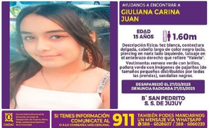 Sus familiares y la Policía buscan a una adolescente de 15 años identificada como Giuliana Carina Juan que, según los familiares, fue raptada por dos a tres hombres que la subieron a la fuerza a un automóvil.