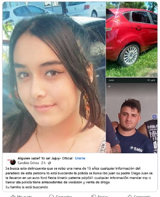 Luego de lo sucedido, familiares de la víctima tras hablar con testigos que presenciaron el rapto lograron identificar a uno de los individuos, como así el vehículo en que se movilizaban al momento de llevarse a la menor por la fuerza. Por lo que, en redes sociales publicaron imagen del individuo como del rodado que habrían usado en el rapto.
