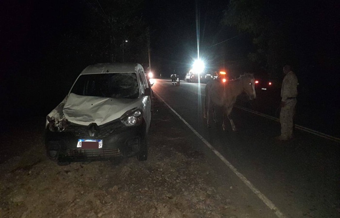 Personal de la División Caballería de la  Unidad Regional 1 acudió de urgencia a la Ruta Provincial 4, a la altura del barrio Las Peras, tras registrarse un choque entre un automóvil Kangoo Express y un animal suelto.