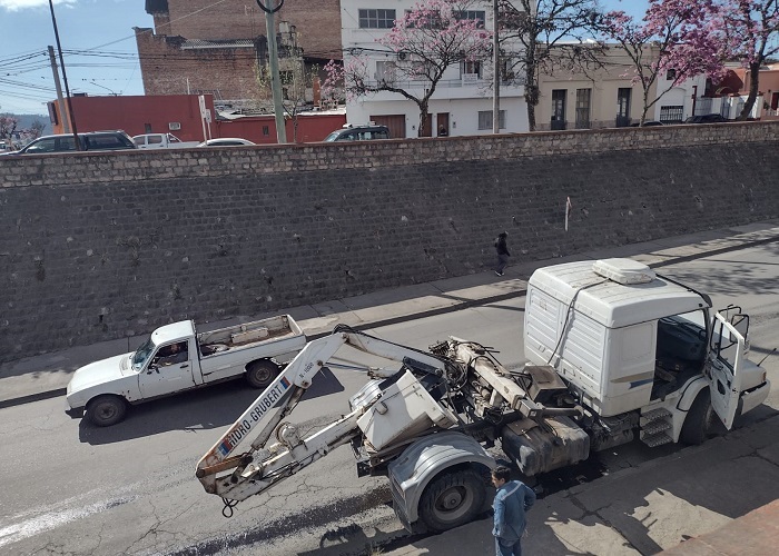 El camión circulaba en el sentido barrio Los Perales hacia el centro de la ciudad, aparentemente tenía elevada la denominada pluma y al pasar por bajo del puente, este chocó cayendo el mismo en la caja del rodado.