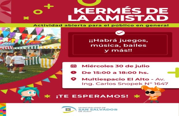 La Municipalidad de San Salvador de Jujuy, a través de la Coordinación de Inclusión, invita a toda la comunidad a participar de la “Kermés de la Amistad”, que se realizará el próximo miércoles 30 de julio a partir de las 15 horas, en el multiespacio El Alto, ubicado en el barrio Alto Comedero.