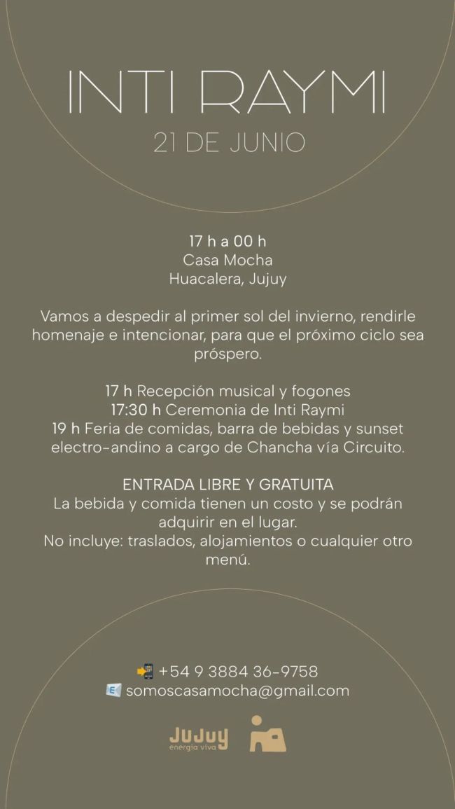 Casa Mocha celebrará este sábado 21 de junio, de 17 a 00 h, el Inti Raymi, la Fiesta del Sol, una de las festividades más importantes del calendario andino. El evento, de entrada libre y gratuita, contará con una variada propuesta de música, gastronomía y cultura, con el apoyo del Ministerio de Cultura y Turismo de Jujuy.
