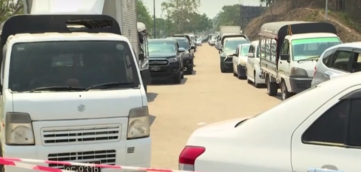 Automovilistas hacen cola durante horas para conseguir gasolina en Naypyidaw, la capital de Birmania, después de que la junta impone