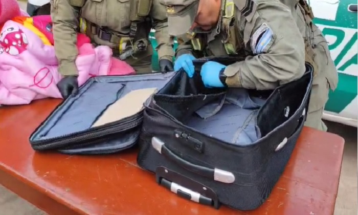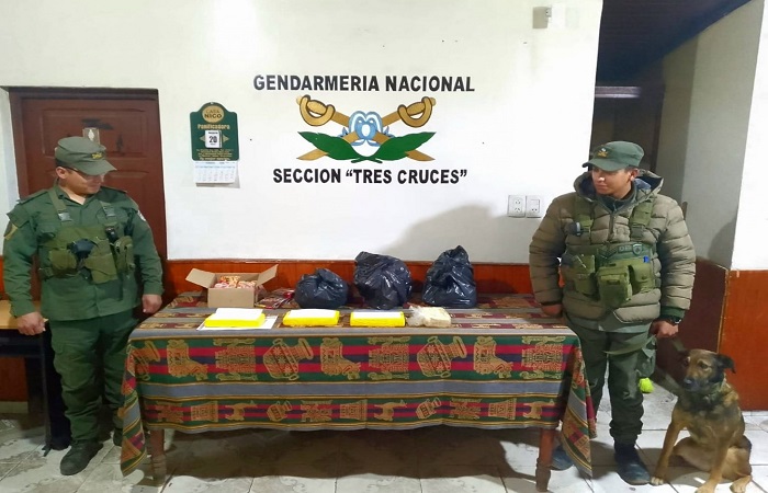 El can antinarcóticos “Tati” reaccionó al olfatear asientos sin pasajeros en un transporte público. Gendarmes de la Sección “Tres Cruces”,