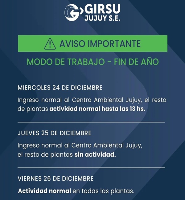 La empresa GIRSU S.E. dio a conocer cómo se desarrollarán las actividades en sus distintas plantas durante las celebraciones de Navidad y