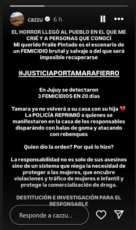 Aunque toda la comunidad se encuentra conmocionada por el hecho, la cantante Cazzu también mostró su repudio a través de redes sociales y es que este crimen la atraviesa de manera personal, pues el pueblo Fraile Pintado fue el lugar donde ella nació, creció y formó lazos con la comunidad.