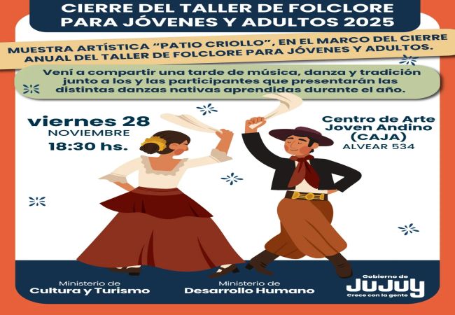 El Ministerio de Desarrollo Humano, a través de la Dirección de Juventud de la Secretaría de Niñez, Adolescencia y Familia, llevará adelante la muestra artística “Patio Criollo”, un encuentro que marca el cierre anual del Taller de Folclore para Jóvenes y Adultos 2025, consolidando una propuesta que fortaleció la identidad cultural y la participación comunitaria a lo largo de todo el año.