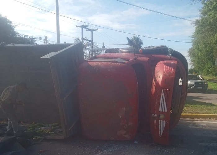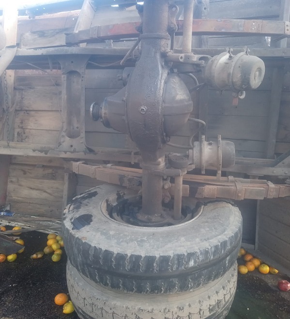 Este lunes un camión cargado con frutas fue colisionado por otro rodado lo que hizo que vuelque y la mercadería que transportaba quedó volcada en el pavimento, y vecinos se la llevaron.