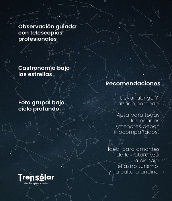 Diseñada para todo público, la experiencia de turismo astronómico, parte desde San Salvador de Jujuy y -desde Salta- hacia la estación de Volcán, donde los pasajeros abordan el Tren Solar, un vehículo 100% sustentable que funciona con energía solar y baterías de litio. Equipado con techo y ventanales panorámicos, el tren ofrece vistas privilegiadas del paisaje de la Quebrada, mientras guías especializados introducen a los viajeros en el mundo de la astronomía y la cosmovisión andina.