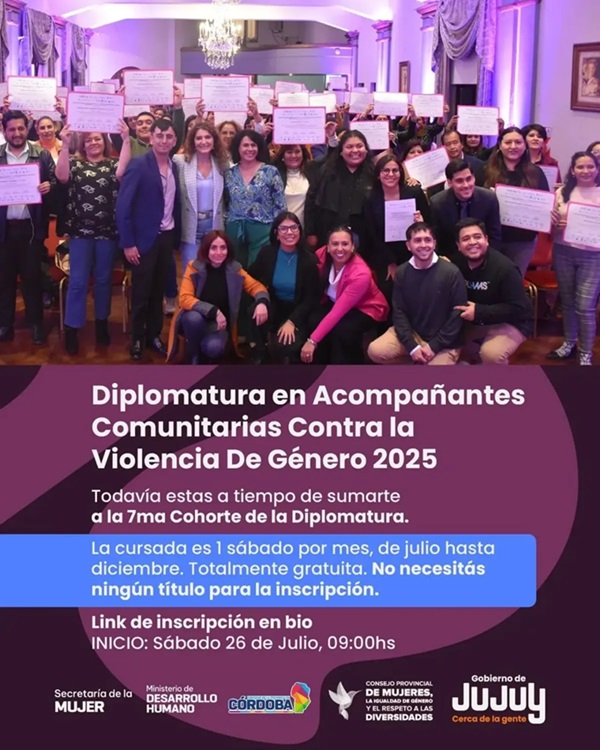 El Consejo Provincial de Mujeres, la Igualdad de Género y el respeto a las Diversidades informa que continúa abierta la inscripción para la 7ª Cohorte de la Diplomatura en Acompañantes Comunitarias/os Contra la Violencia de Género. Esta propuesta formativa es gratuita y accesible.