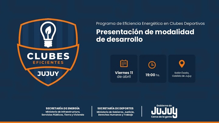 Las presentación se realizará este viernes 11 de abril en el Salón Éxodo, espacio que ofrece El Cabildo de Jujuy, a las 19.00hs. En la ocasión, autoridades de las Energía y de Deportes presentarán, ante representantes de los clubes deportivos que participarán, la modalidad de desarrollo prevista en ‘Clubes Eficientes’ para la implementación de medidas de eficiencia energética en los espacios de los clubes.