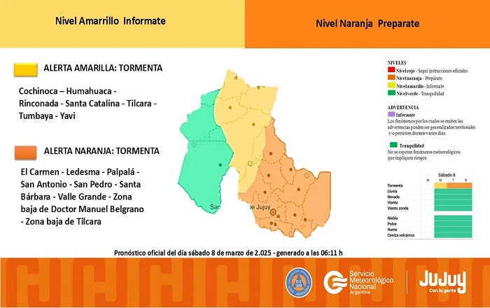 Alerta nivel naranja por tormenta para las zonas de El Carmen – Ledesma – Palpalá – San Antonio – San Pedro – Santa Bárbara – Valle Grande – Zona baja de Doctor Manuel Belgrano – Zona baja de Tilcara. Alerta nivel amarillo por tormenta para las zonas de Cochinoca – Rinconada – Santa Catalina – Súsques- Humahuaca- Tilcara- Tumbaya.