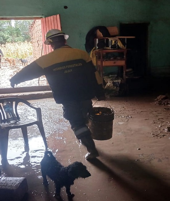 Por otro lado, personal del Cuartel de Bomberos de Humahuaca trabaja en la localidad de Huacalera, colaborando con la extracción de barro y agua de las distintas viviendas afectadas por el temporal.