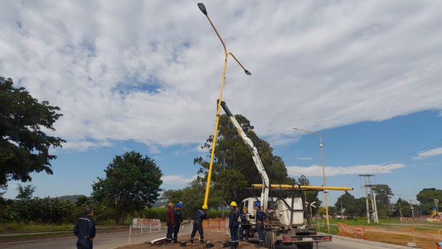 La Municipalidad de San Pedro de Jujuy, a través de personal de Alumbrado Público, realizó esta mañana la instalación de columnas y luminarias led en el sector de la nueva rotonda que se construyó en el acceso sur a nuestra ciudad.
