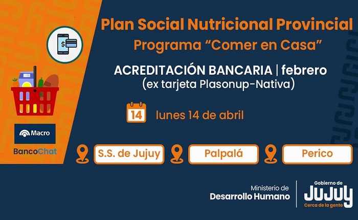 El Ministerio de Desarrollo Humano de Jujuy, mediante la Secretaría de Asistencia Directa, comunica que desde hoy, lunes 14 de abril, se realizó la acreditación bancaria de la ex Tarjeta PLASONUP-Nativa, correspondiente a febrero, para titulares de San Salvador, Palpalá y Perico.