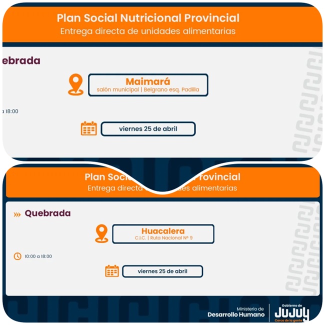 El Ministerio de Desarrollo Humano, mediante la Secretaría de Asistencia Directa, comunica que el viernes 25 de abril, se efectuará la entrega directa de módulos alimentarios del programa “Comer en Casa”, a familias de Maimará y Huacalera.