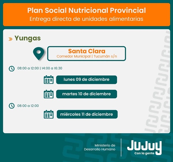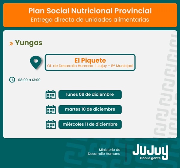 El Ministerio de Desarrollo Humano, a través de la Secretaría de Asistencia Directa, comunica que desde el lunes 9 de diciembre, tendrá lugar la entrega de módulos alimentarios del programa provincial “Comer en Casa”, a familias de San Antonio, El Piquete, Santa Clara y Vinalito.