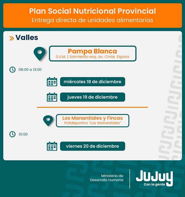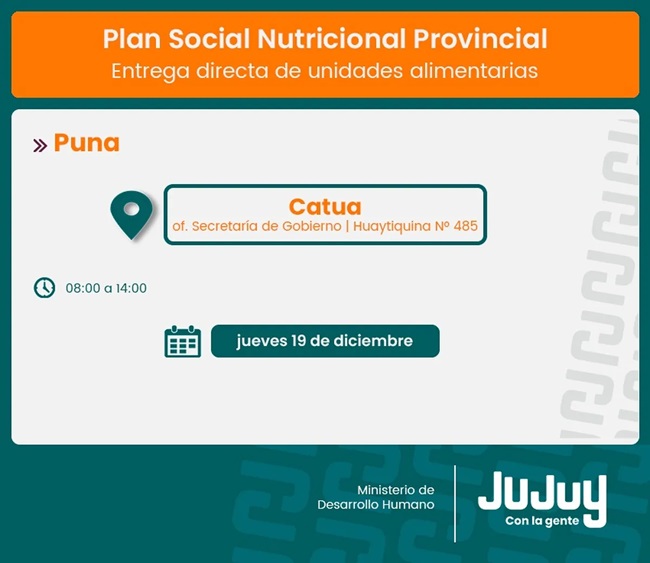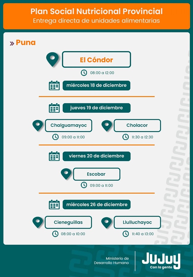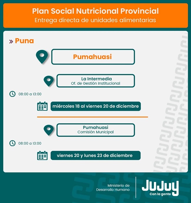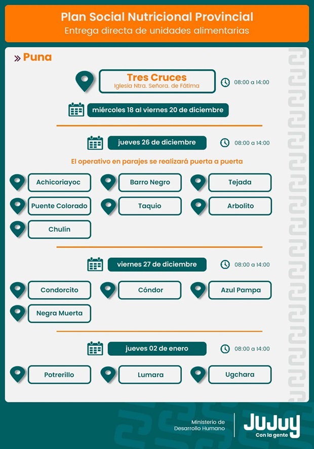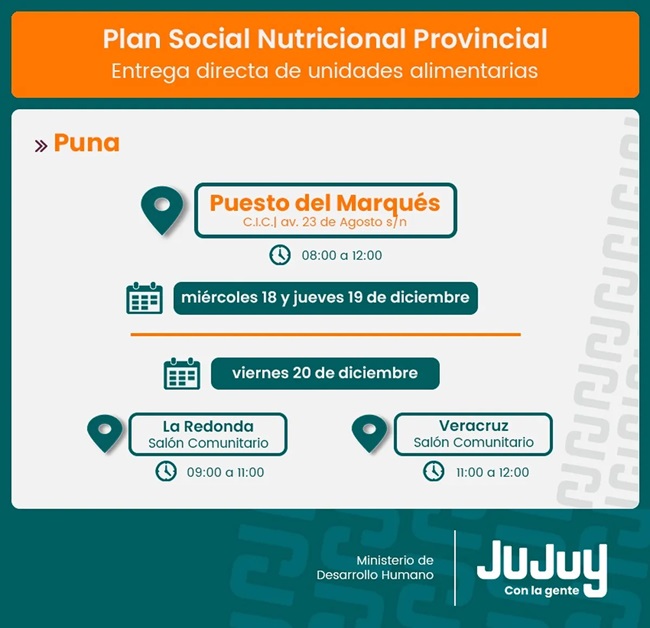 El Ministerio de Desarrollo Humano, por medio de la Secretaría de Asistencia Directa, comunica que a partir de este miércoles 18 de diciembre, se efectuará la entrega directa de módulos alimentarios del Programa “Comer en Casa”, a familias de Pampa Blanca, El Cóndor, Pumahuasi, Puesto del Marqués, Tres Cruces, Catua, Cieneguillas, Cangrejillos y Paso de Jama.