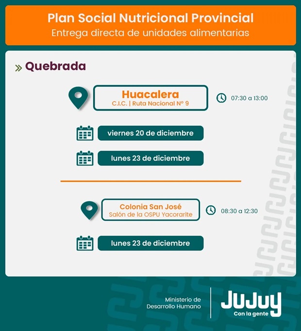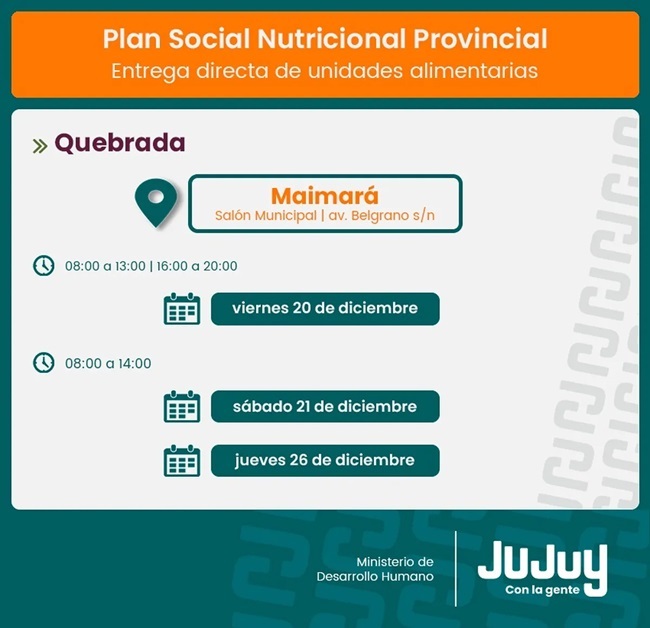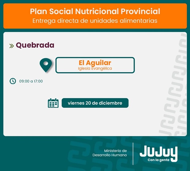 El Ministerio de Desarrollo Humano, por medio de la Secretaría de Asistencia Directa, comunica que a partir del viernes 20 de diciembre, se realizará la entrega de módulos alimentarios del Programa “Comer en Casa”, a familias de Huacalera, Humahuaca, Maimará y El Aguilar.