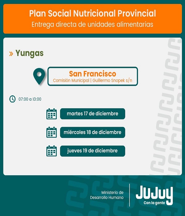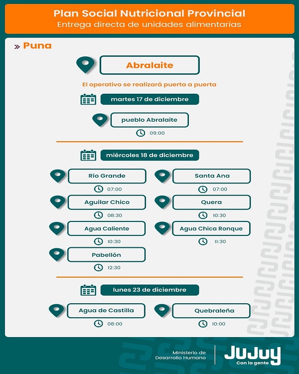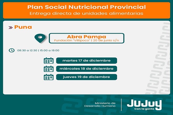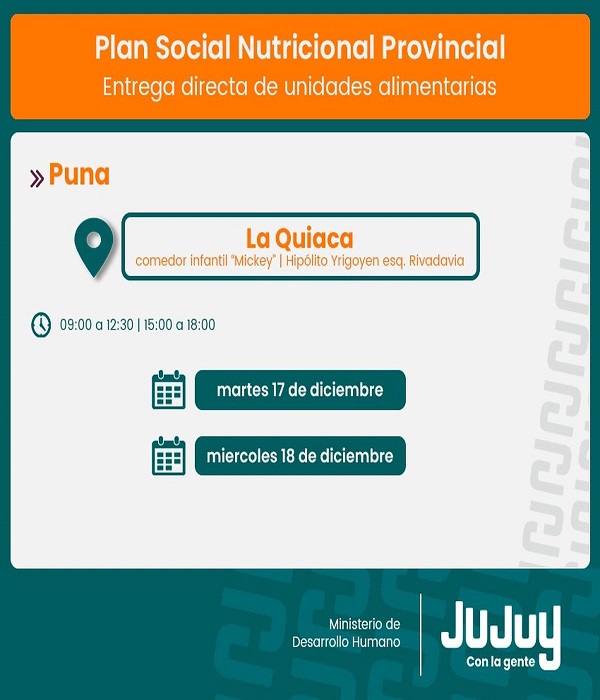 El Ministerio de Desarrollo Humano, por medio de la Secretaría de Asistencia Directa, comunica que desde el martes 17 de diciembre, se efectuará la entrega de refuerzos alimentarios del programa “Comer en Casa”, a familias de Caspalá, San Francisco, La Quiaca, Abra Pampa y Abralaite.