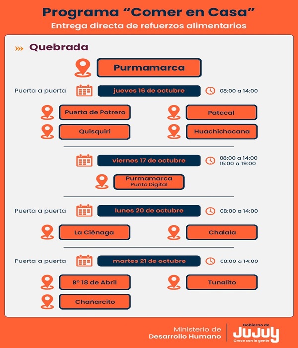 El Ministerio de Desarrollo Humano, a través de la Secretaría de Asistencia Directa, informa que desde el jueves 16 al martes 21 de octubre en la localidad Purmamarca, tendrá lugar el operativo de entrega directa de refuerzos alimentarios del programa “Comer en Casa”.