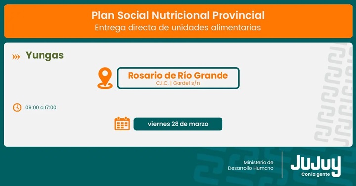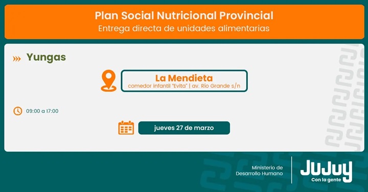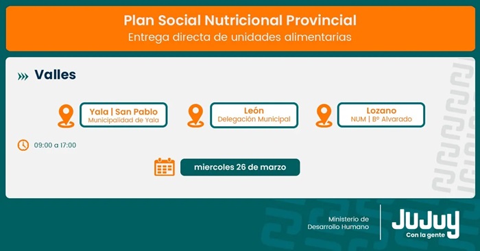 El Ministerio de Desarrollo Humano de Jujuy, a través de la Secretaría de Asistencia Directa, comunica que desde el miércoles 26 de marzo se ejecutará la entrega de refuerzos alimentarios del programa “Comer en Casa” a familias de Yala, Lozano, León, Arrayanal, La Esperanza, La Mendieta, Rosario de Río Grande y San Pedro.