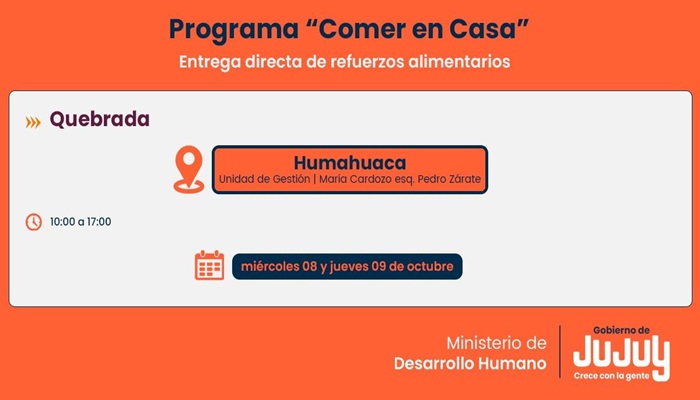 El Ministerio de Desarrollo Humano, a través de la Secretaría de Asistencia Directa, comunica que el miércoles 8 y el jueves 9 de octubre se realizará la entrega directa de las Unidades Alimentarias del programa “Comer en Casa” del Plan Social Nutricional Provincial (Pla.So.Nu.P.) a familias de Humahuaca.