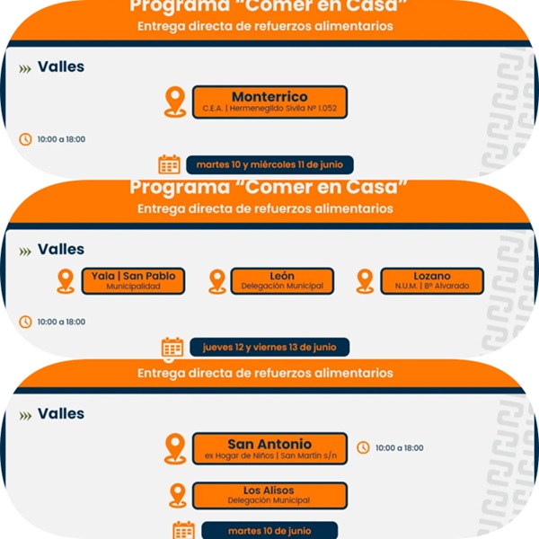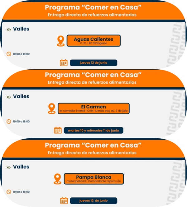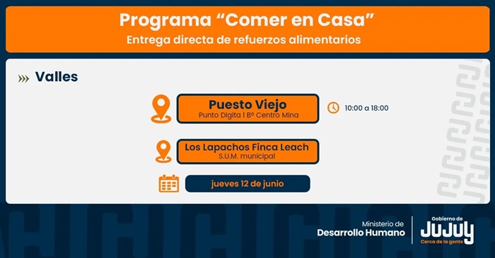 El Ministerio de Desarrollo Humano de Jujuy, a través de la Secretaría de Asistencia Directa, comunica que desde el martes 10 de junio, se realizará la entrega directa de módulos alimentarios del Programa “Comer en Casa” a familias de ocho localidades de la región Valles.