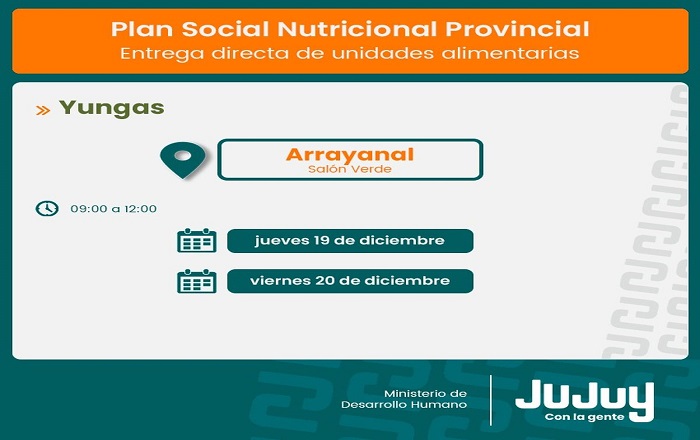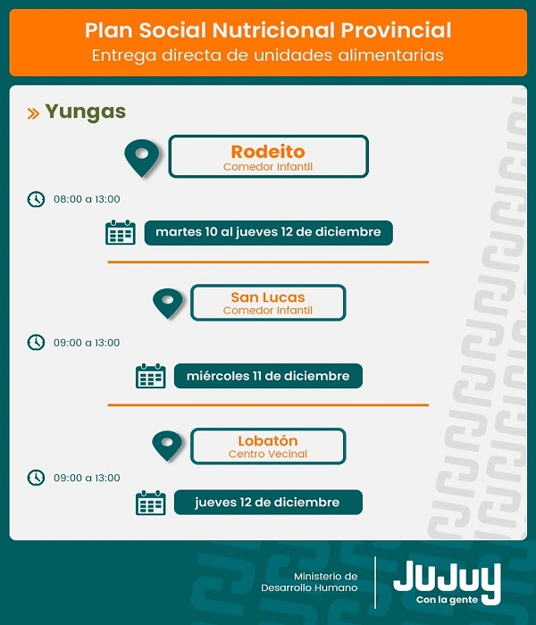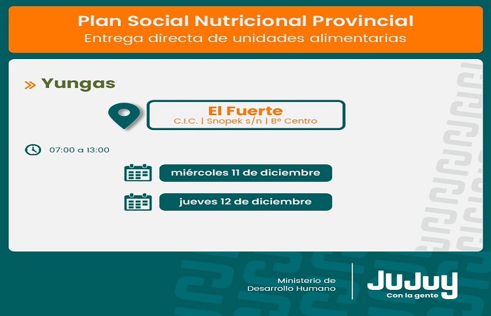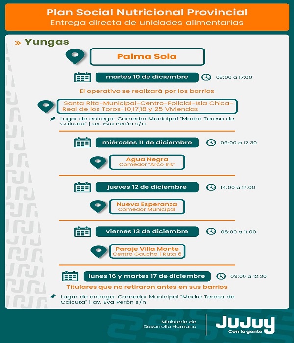 El Ministerio de Desarrollo Humano, desde la Secretaría de Asistencia Directa, comunica que a partir de este martes 10 de diciembre, se concretará la entrega unidades alimentarias del programa “Comer en Casa” a familias de Palma Sola, Rodeíto, El Fuerte y Arrayanal.