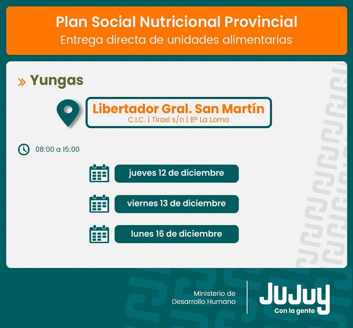 El Ministerio de Desarrollo Humano de Jujuy, mediante la Secretaría de Asistencia Directa, comunica que desde el jueves 12 al lunes 16 de diciembre, tendrá lugar la entrega de refuerzos alimentarios del Programa “Comer en Casa” a familias de Libertador General San Martín.
