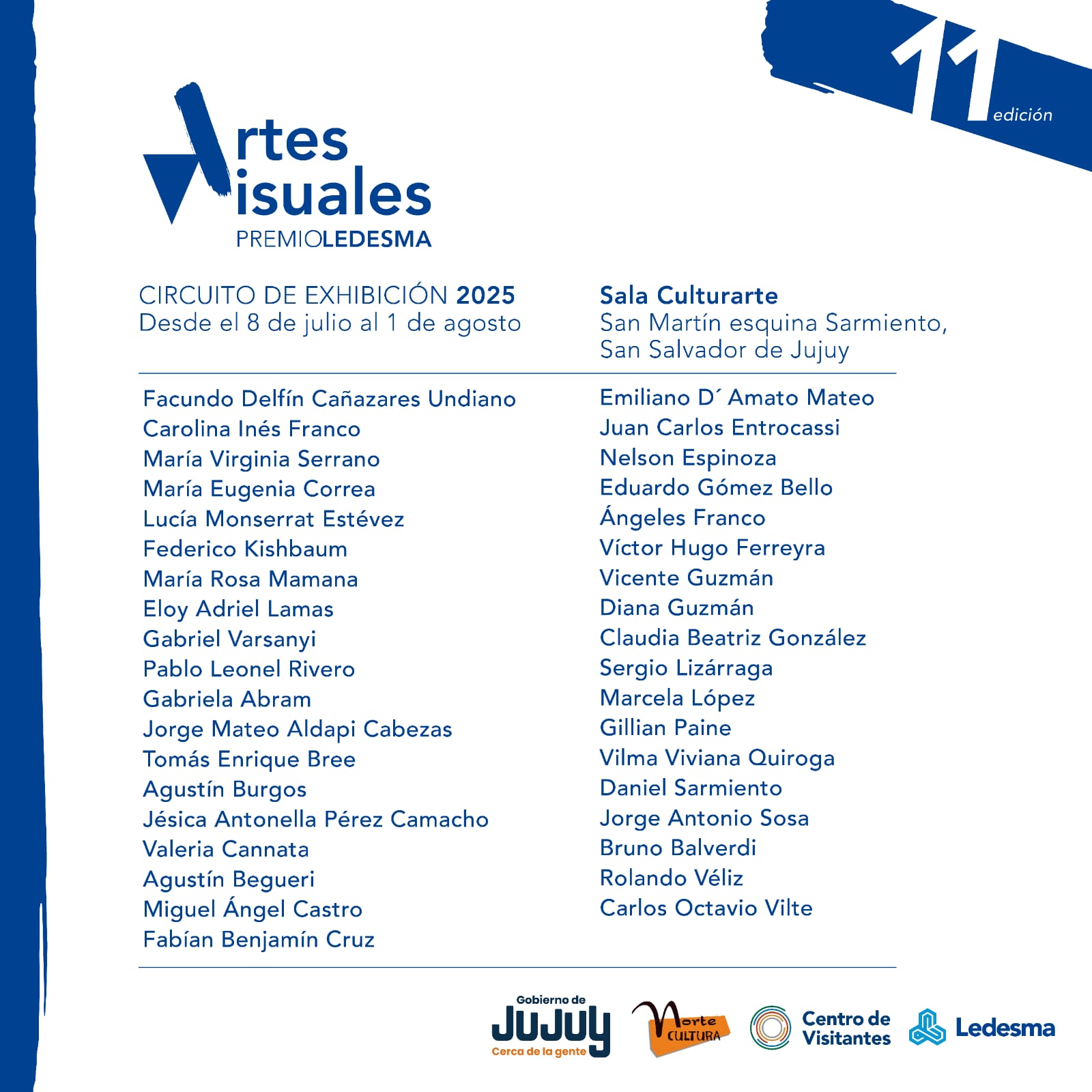 Este martes 8 de julio a las 19:30 horas en Culturarte, se realizará la inauguración oficial de la «11º edición del Premio Ledesma de Artes Visuales», oportunidad en la que se entregarán los premios y las distinciones a los artistas ganadores de este año.