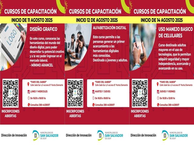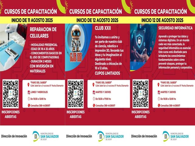 Para más información sobre inscripciones y disponibilidad de cupos, las personas interesadas podrán acercarse al Faro del Saber o al Punto Digital “Jorge Cafrune” en los horarios correspondientes, o consultar a través del número telefónico: 388-4438007.