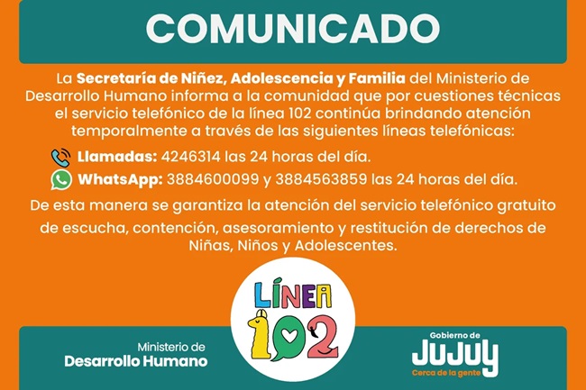 La Secretaría de Niñez, Adolescencia y Familia del Ministerio de Desarrollo Humano informa a la comunidad que, por cuestiones técnicas, el servicio telefónico de la Línea 102 continúa brindando atención temporalmente a través de los siguientes canales: