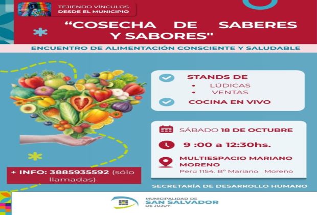 La Municipalidad de San Salvador de Jujuy, a través de la Dirección de Salud Integral y Género dependiente de la Secretaría de Desarrollo Humano, invita a participar del Encuentro de Alimentación Saludable “Cosecha de Saberes y Sabores”, una propuesta pensada para fomentar prácticas de alimentación consciente, accesible y saludable.