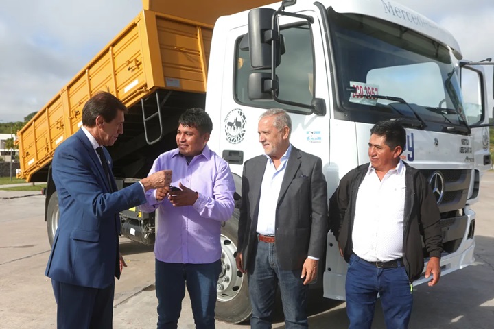 El primer mandatario, junto al ministro de Desarrollo Económico y Producción, Juan Carlos Abud Robles, entregó un camión volcador 0 km, adquirido con los fondos provenientes de la aplicación de la Ley de Regalías Mineras.